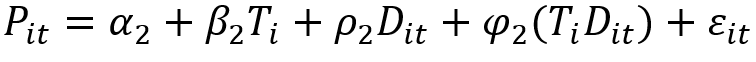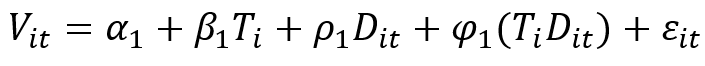Donde V es el número de votos totales que se recibieron en la i-ésima colonia en la consulta para elegir proyecto ganador para el PP en el año t. La variable D toma un valor de 1 si la colonia recibió un incremento en sus recursos para el PP mayor o igual al 100 %, y cero en otro caso, mientras que la variable T toma un valor de 0 para el 2018 y 1 para el 2022, ya que el tratamiento ocurrió en el 2019.