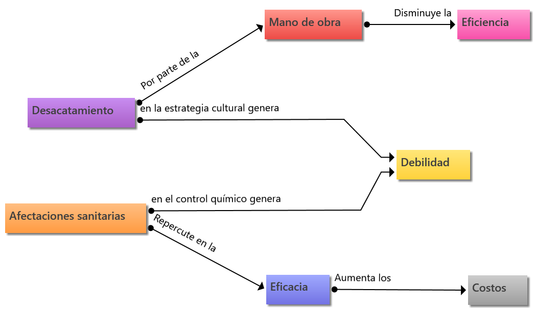 El entrevistado expone que las estrategias culturales y de control químico efectuadas en el manejo de Hypothenemus hampei presentan debilidades. Por un lado, el productor menciona que la estrategia cultural requiere de compromiso por parte de la mano de obra, la cual entre sus actividades se debe incluir la oportuna recolección evitando la caída de los frutos maduros. Según lo mencionado anteriormente, Bustillo (2006), indica que entre las prácticas culturales es factible que los recolectores eviten dejar frutos maduros de café en los árboles, y de igual forma mitigar la caída de los mismos al suelo, debido a que estos últimos se convierten en un reservorio con condiciones óptimas para su reproducción, lo que genera mayor dificultad en el manejo y control del insecto fitófago. En efecto, los recolectores destinados a esta actividad muestran comportamientos de desacatamiento. Por lo que, ante la mala ejecución de esta actividad se tiene una disminución en la eficiencia en el manejo oportuno de Hypothenemus hampei en el cultivo de café.