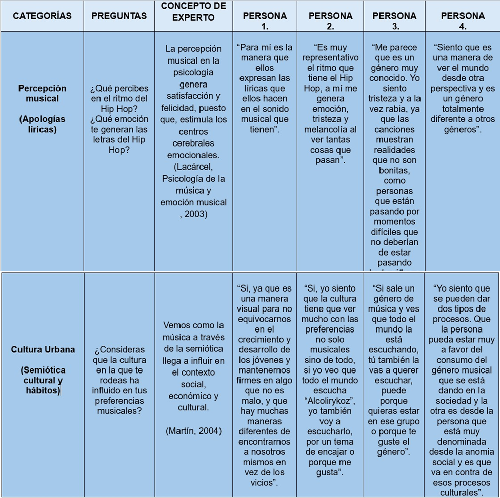La información obtenida de esta entrevista se analizará para cumplir con los objetivos primarios de análisis, tales como la comprensión de la percepción musical, la cultura, el género musical del hip hop, la influencia social, el desarrollo emocional de los jóvenes en cuanto a sus experiencias, su formación y asociación personal hacia los géneros musicales.