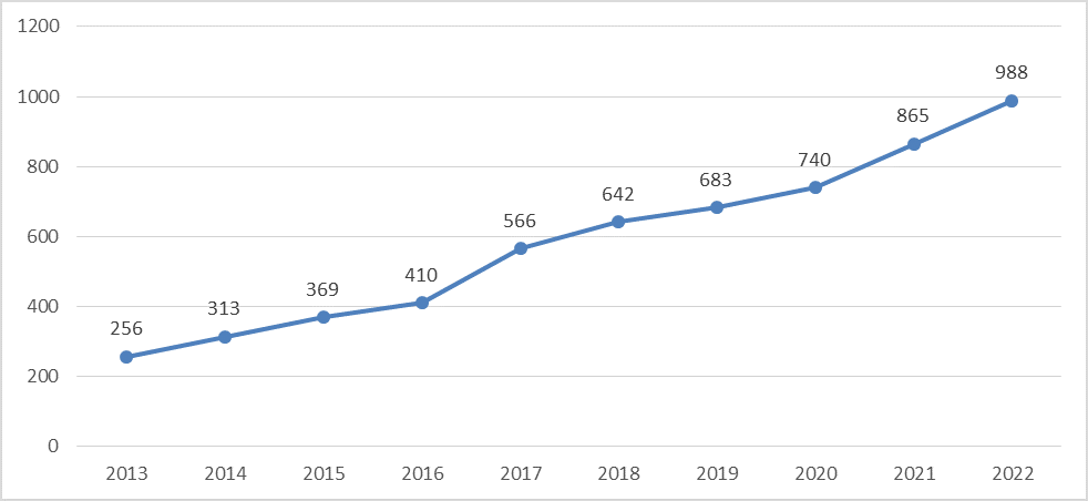Predominaron los artículos publicados en el año 2022 con 988 investigaciones (16,94 %). Este año fue seguido del 2021 y 2020 con 865 (14,83 %) y 740 (12,68 %) artículos respectivamente figura 1.