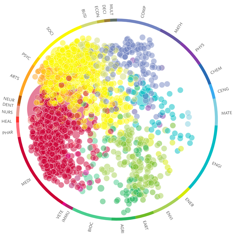 Dentro de las áreas temáticas con mayor número de articulo publicados se encuentran las ciencias sociales (2 639 investigaciones; 45,25 %), medicina (2 356 artículos; 40,39 %) y las ciencias relacionadas con el medio ambiente (691 trabajos; 83,05 %). A su vez, la relación entre las distintas áreas temáticas fue heterogénea en su mayoría, con mayor participación de las ciencias médicas (medicina, enfermería, profesionales de la salud entre otras: identificadas de color rojo) figura 2.