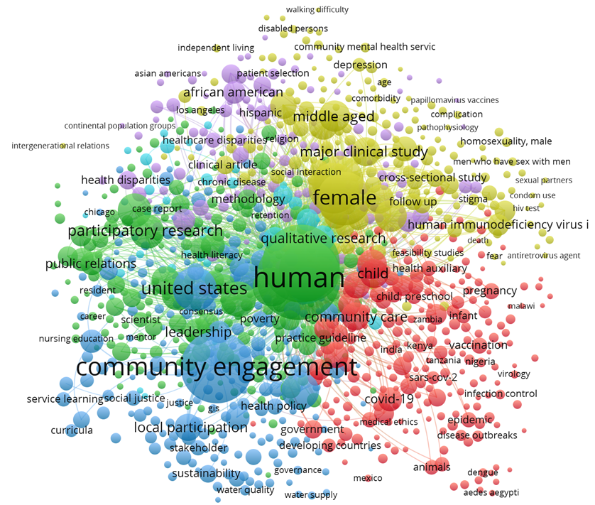 Se identificaron 6 clúster de concurrencia de términos, distribuidos de la siguiente manera: Clúster 1 (rojo) se relacionó con términos referentes a COVID-19, pandemia, infecciones, enfermedades virales entre otras. El Clúster 2 (verde) relacionado con temas de participación comunitaria, formación profesional, profesionales de la salud y habilidades comunicativas. El Clúster 3 (azul) relacionó los términos referentes al sostenimiento y las relaciones en las comunidades, así como el comportamiento de los factores de riesgos ambientales. El Clúster 4 (amarillo) abarcó temas en relación con el comportamiento poblaciones en las comunidades, la identidad de género y otros temas afines. Por su parte el Clúster 5 (violeta) se relacionó con las afecciones de salud que pueden afectar e incidir en la comunidad. Por otra parte, el Clúster 6 (celeste) abarcó el resto de las temáticas figura 3A. El comportamiento de la densidad de los términos reflejó un mayor predominio de los términos: female, human y community engagment figura 3B.