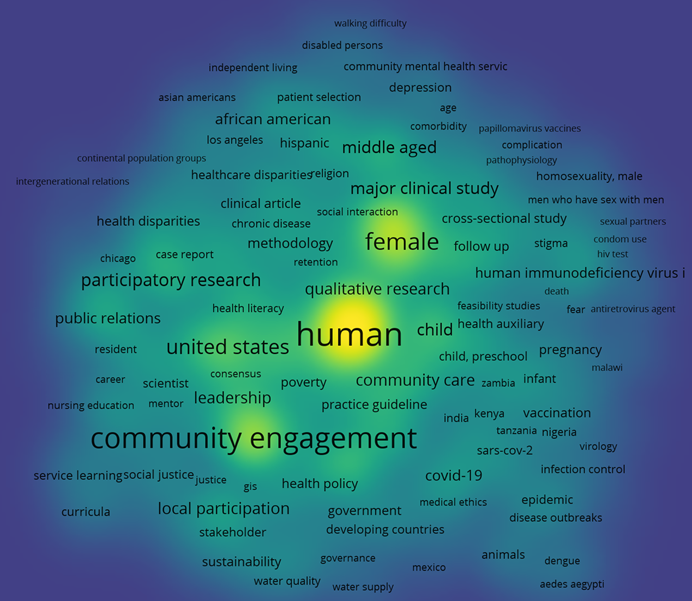 Six clusters of concurrence of terms were identified, distributed as follows: Cluster 1 (red) was related to terms referring to COVID-19, pandemic, infections, viral diseases among others. Cluster 2 (green) related to community participation, professional training, health professionals and communication skills. Cluster 3 (blue) related to terms referring to sustainability and relationships in the communities, as well as the behavior of environmental risk factors. Cluster 4 (yellow) covered topics related to the behavior of populations in the communities, gender identity and other related topics. Cluster 5 (purple) was related to health conditions that may affect and influence the community. On the other hand, Cluster 6 (light blue) covered the rest of the topics figure 3 A). The behavior of term density reflected a greater predominance of the terms: female, human and community engagement figure 3 B.