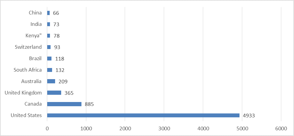 Research with authors from the United States (4 933 articles; 84,58 %) and Canada (885 papers; 15,17 %) stood out figure 4.