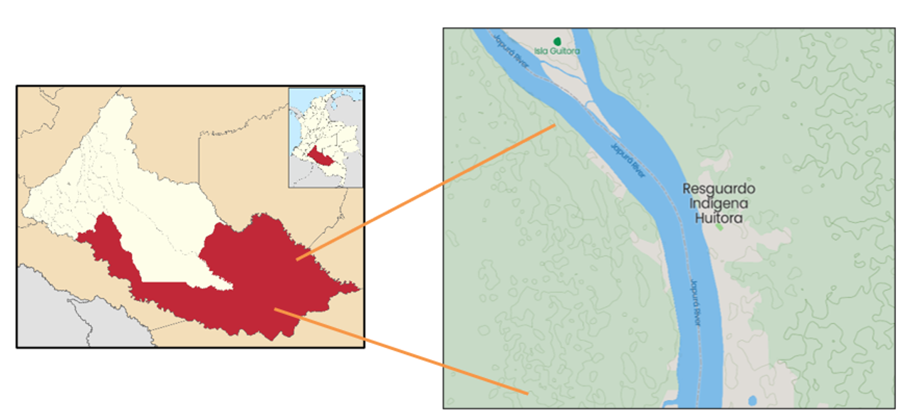 El sitio de estudio está ubicado en el Resguardo Indígena Huitorá del Municipio Solano Caquetá (Figura 2). Cuenta con una extensión territorial de 67 220 hectáreas y 89 habitantes de esta comunidad (Latitud: 0.163156 Longitud: -74.6727). Sus límites se enmarcan al norte con vecinos colonos y al ser con veredas Tres tronco, la Mana del municipio de Solano Caquetá, el resguardo Huitorá limita al suroeste con el Caquetá y por el oeste con el caño Orotuya y este con el caño Peneya.(USAID,2013).