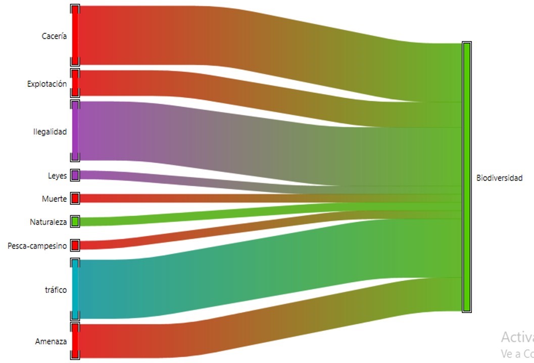 b) that had been maintained throughout the process, a direct relationship in experiences of wildlife trafficking and hunting. Once selected, the informant conducted an interview, which was recorded, then proceeded to pass the interview to Word, made various comments with the keywords, and then passed it to plain text. After this, the plain text was passed using the program Atlasti_22, the phrases of interest were selected, and then the codes were established, which were classified by families, taking into account similarities; the Word cloud was created where the words without major relevance were removed. Finally, the existing codes in each family were established, resulting in a network. Finally, the Sankey diagram was made; therefore, with these data, the description of the findings and the triangulation of the results.