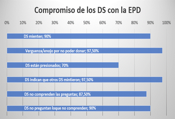 La EPD busca la verdad. Se basa en brindar información verídica para generar un bien. Se fundamenta en la veracidad. Se busca que la persona aporte precisión. Quienes mienten en la EPD pretenden engañar a otro, conseguir un determinado fin que es la extracción de sangre. Actúan bajo la premisa de su bienestar, la esperanza de ayudar a un familiar, no realmente a favor de los vulnerables. Esta situación surge desde una conducta irresponsable. Se busca plasmar en el formulario la historia médica del DS, apelando a su memoria. Se espera que la entrevista se base en la verdad, entendiendo que se obtiene la veracidad ya que debe existir un sesgo debido a la subjetividad personal, lo que genera una subjetividad biográfica.